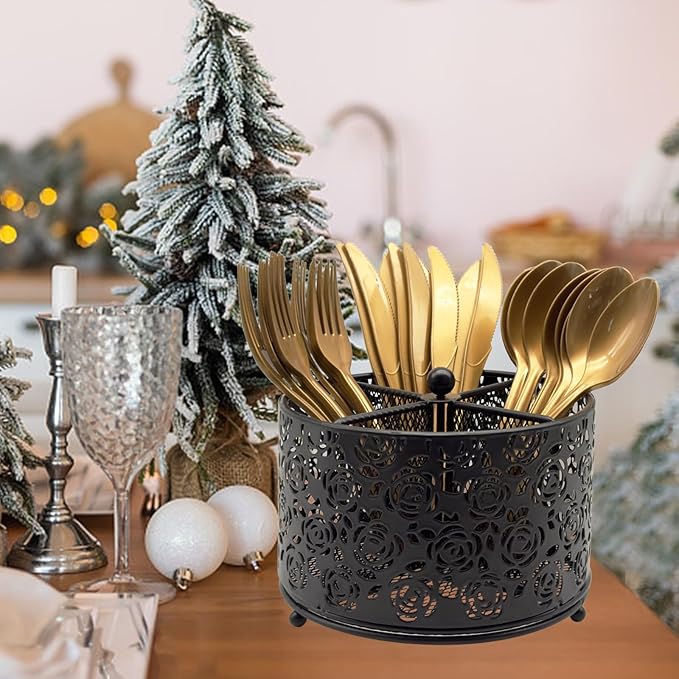 - 360° Rotating & Always Stand Up: Well made of all black metal mesh and stainless steel drain holes provide enough breathing space for the utensil holder. The silverware holder for countertop with 360-degree rotation makes the metal caddy easier to use. In addition, the small utensil organizer got a weighted base so won't tip over easily.