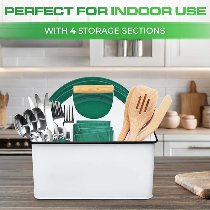 - Galvanized Caddy with Handle: This silverware caddy is a must-have for summer pool parties, picnics, patio, and other occasions. Designed to hold utensils, napkins, condiments, and plates, this large utensil holder features a durable construction that resists corrosion and scratches.