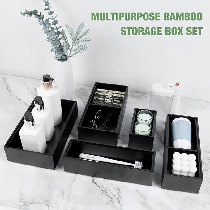 Bamboo Drawer Organizer, 5-Piece Silverware & Kitchen Organizer Set with Removable Dividers for Kitchen, Utensils, Bathroom, Office, Makeup (Black)