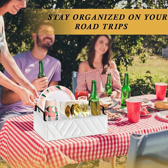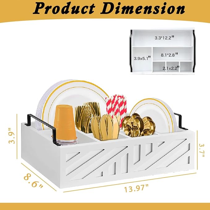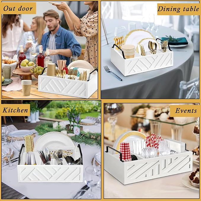 - VERSATILE: This paper plate holder with 6 compartments is not only used for organizing paper plates but also napkins, cups and other kitchen accessories. The compact structure of the silverware caddy for parties makes it suitable for countertops, cabinets and even outdoor setup.