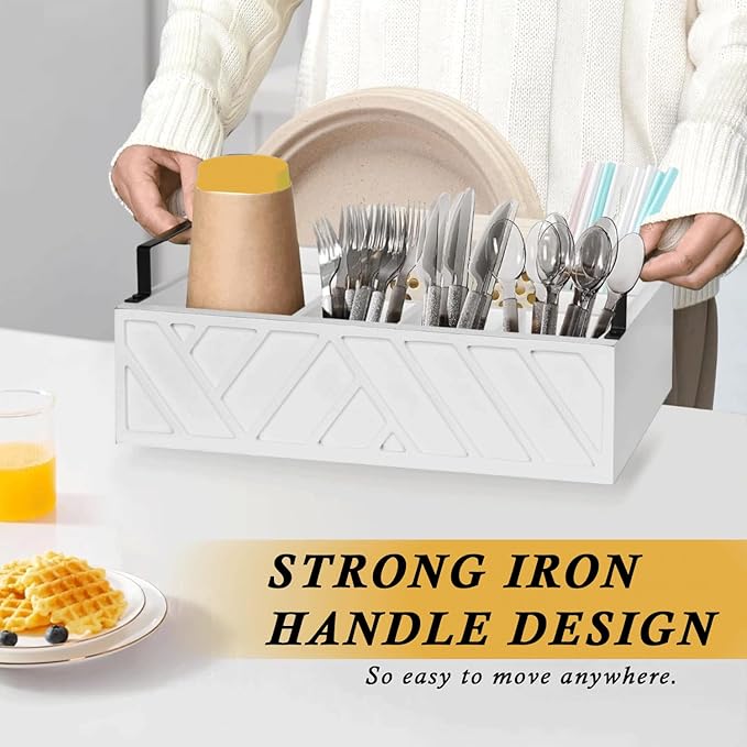 - STURDY METAL HANDLES: Our flatware organizer features two metal handles for easy carry anywhere. This utensil holder for the party will brighten their eyes when your friends and family pick up their plates from the wooden kitchen paper plate.