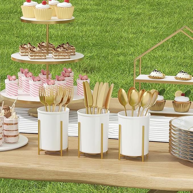 - Elegant & Sturdy: Crafted from food-grade PP material with a golden metal stand, this utensil holder offers stability and minimizes tipping when placing or retrieving utensils. Its elegant and stylish appearance makes it a great decoration for kitchens, dining tables, and parties