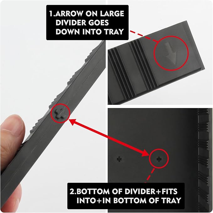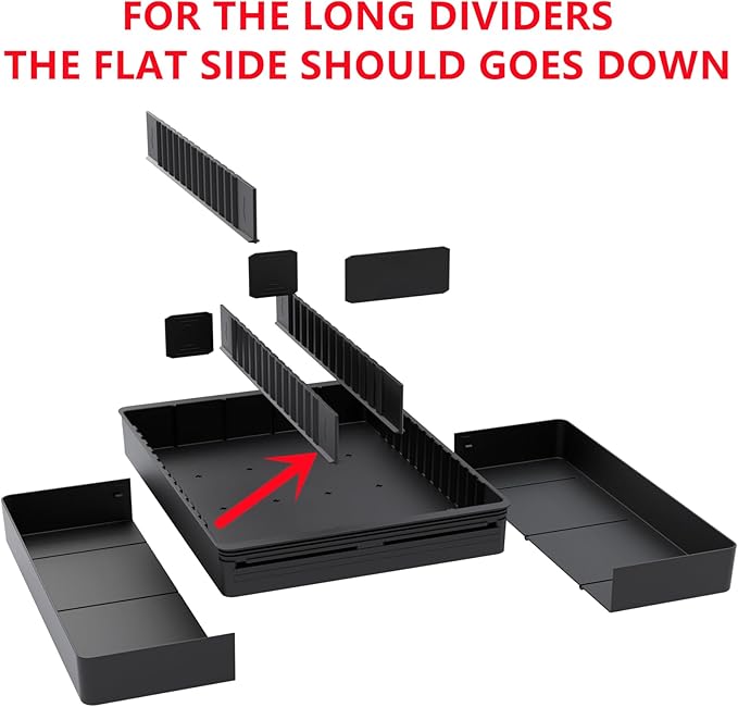 - DIY Customize: Comes with 16 pieces of DIY dividers of different sizes ( NOTICE: ARROW ON LARGE DIVIDER GOES DOWN INTO TRAY!!! ), you can customize based on your needs .Organize your kitchen drawer and make more space with this silverware organizer. And two expandable panels on the left and right to store more silverware, cutlery, and kitchen utensils.