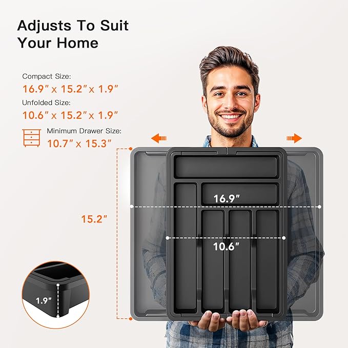 - Adjusts To Suit Your Space: Featuring a clever expandable design, this drawer organizer fits a variety of drawer sizes and shapes. It measures 10.6" in width when folded, expanding up to 16.9" when fully extended, with a length of 15.1" and a height of 1.9" – a utensil drawer organizer versatile enough for almost all your storage needs.