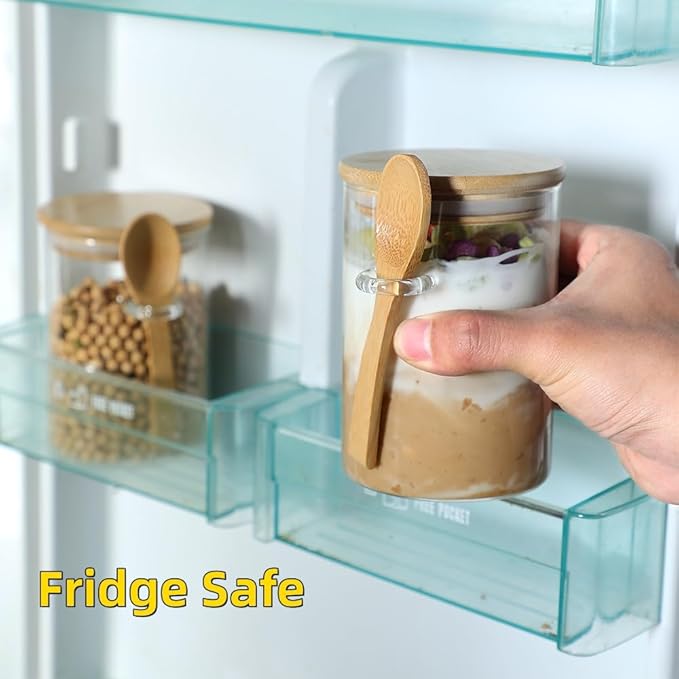 - ✔【Product Capacity】 The glass overnight oats containers with spoon and lid's size is 3.35x4.72 inch(8.5cmx12cm), can hold about 17 OZ liquid.
