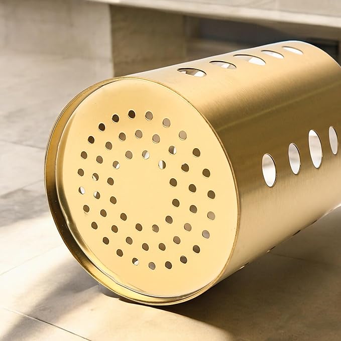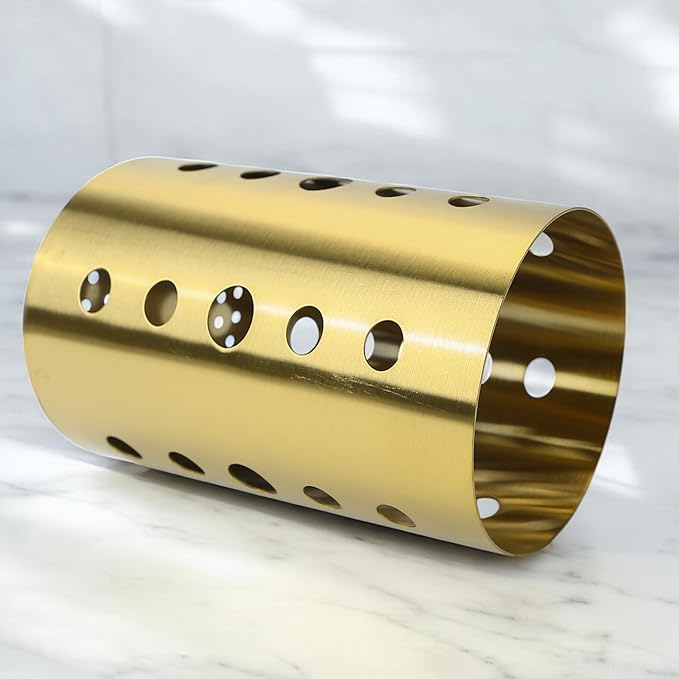 Gold Stainless Steel Utensil Holder 3.93x6.9 inch – Flatware Cylinder Draining Organizer & Drying Rack Caddy Basket for Kitchen Counter with Round Drain Holes, Stand for Fork, Knive, Spoon, Chopstick