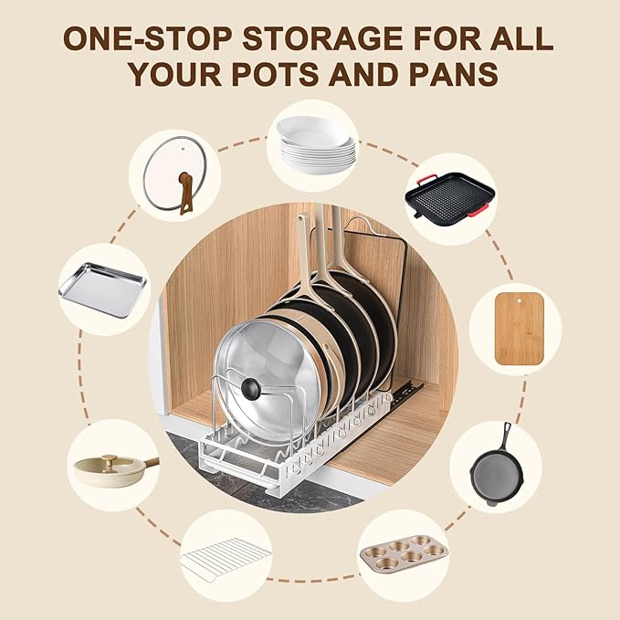 - 【Slide-Out & Space Saving】The lid organizer inside cabinet is equipped with industrial-grade smooth sliding rails to ensure noiseless and stable operation, Easy to take out and place items,This allows you to maximize kitchen cabinet space efficiently and tidy.