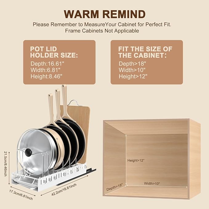 - 【Warm Reminder】DOES NOT FIT FRAMED CABINET.Please measure the size of your cabinet before purchasing to ensure that this pan organizer inside cabinet perfectly fits with pans and lids in place.Suitable for 6-10 inch lightweight pan. Cabinet Width > 10IN, Depth > 18IN, Height > 12IN.