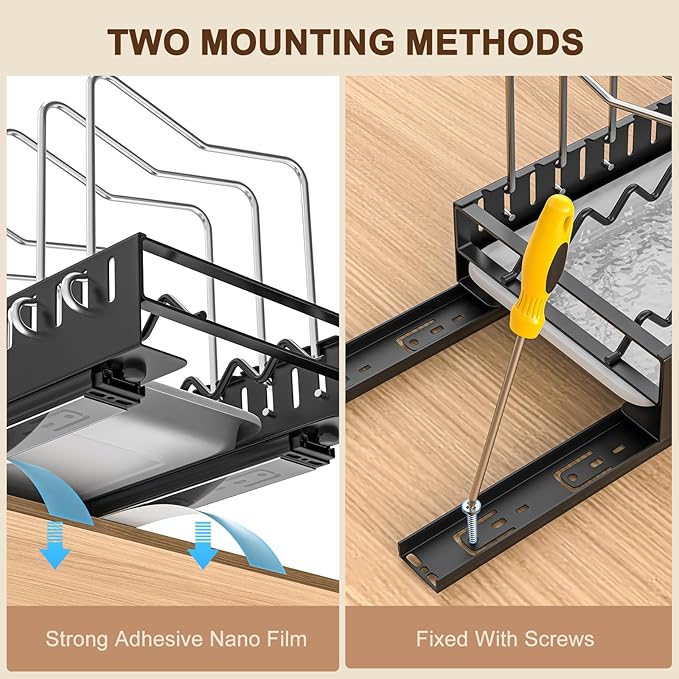 - 【Two Installation Options】: Easy installation :After clean the countertop or inside a cabinettear off the nano glue film and paste it on the countertop or in cabinet ;and screws installation: If there are greater load-bearing requirements, you can choose to fix the product with screws provided after drilling.
