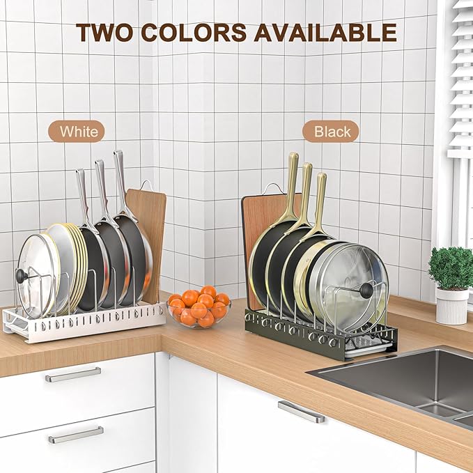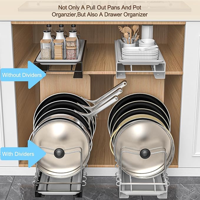 - 【Adjustable 10 Dividers & Muti-Use】: This slide out pot and pan organizer for under cabinet is made to fit specific needs. There the 10 Dividers can be adjusted according to your panspots or lids size. This pot lid organizer is perfect for lids, frying pans, cutting boards, cookie sheets, bakeware, cast iron skillets, roasting pans, baking sheets, Plate,and more. It is a versatile pan organizer.Also,Dividers can be detached, so this pod and pan organizer can also be used as a pull out kitchen cabinet organizer for Spices or other things just as a Pull out drawer organizer for cabinet.