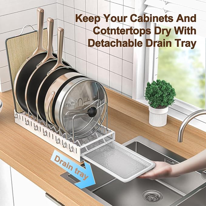 - 【Drain Tray Design】The pull out pots and pans organizer under cabinet comes with an draining tray, It won't allow the residual water drops from the freshly washed pot to fall onto the kitchen cabinet,keep the cabinet dry and clean.