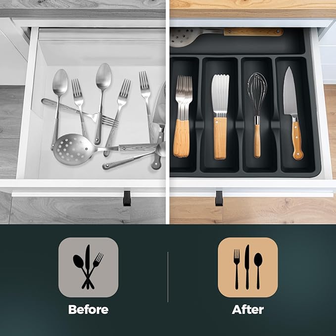 - DESIGNED FOR EFFORTLESS ORGANIZATION: Five thoughtfully sized compartments help you neatly sort forks, knives, spoons, and kitchen utensils—making your drawer look clean, organized, and clutter-free.