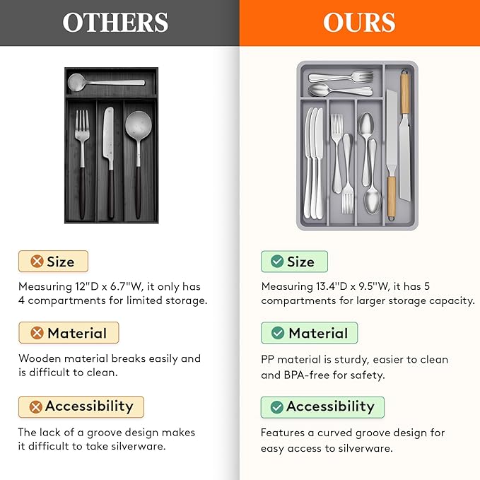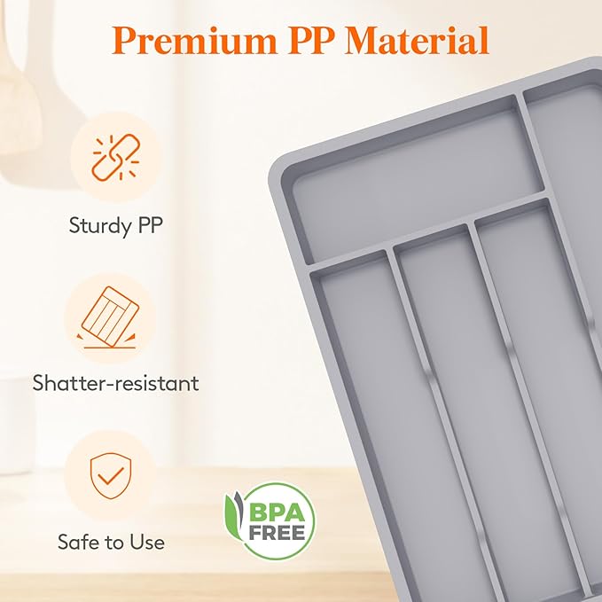 - Sturdy and Safe: Crafted from sturdy food-grade PP material, this kitchen drawer organizer can handle everyday use with ease. Plus, it’s BPA-free, ensuring the safety of all types of utensils.