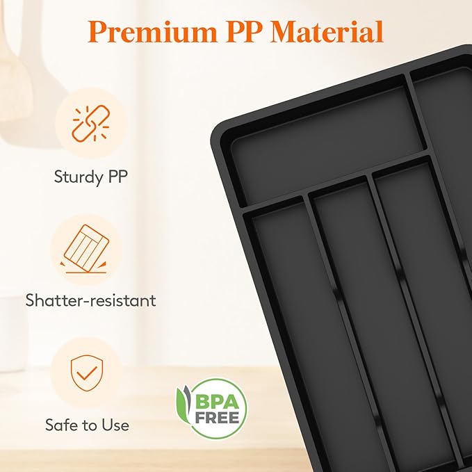 - Sturdy and Safe: Crafted from sturdy food-grade PP material, this kitchen drawer organizer can handle everyday use with ease. Plus, it’s BPA-free, ensuring the safety of all types of utensils.