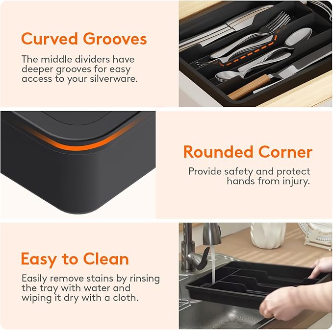 - User-Friendly Design: The silverware tray features curved grooves for easy access to silverware. To clean, simply rinse with water or wipe with a cloth to remove stains. Please note, it is not dishwasher safe