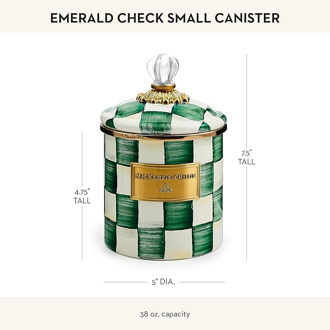 - ELEGANT STORAGE ESSENTIAL: Our Emerald Check enameled steel canister is enchanting and capable. It’s decorated with hand-painted green-and-white checks and topped with a clear glass knob. This cute jar can stand alone or stun in a complete set.