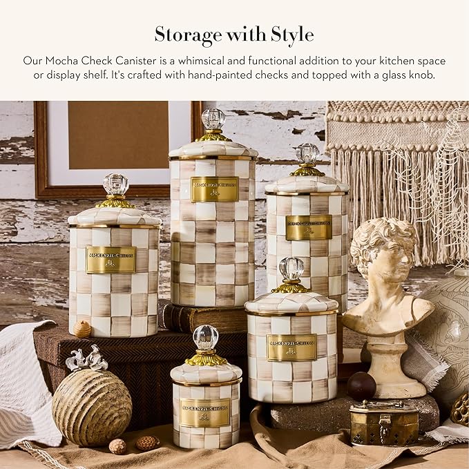 - ELEGANT STORAGE ESSENTIAL: Our Mocha Check enameled steel canister is charming and capable. It’s decorated with hand-painted brown-and-white checks and topped with a clear glass knob. This cute jar can stand alone or stun in a complete set.