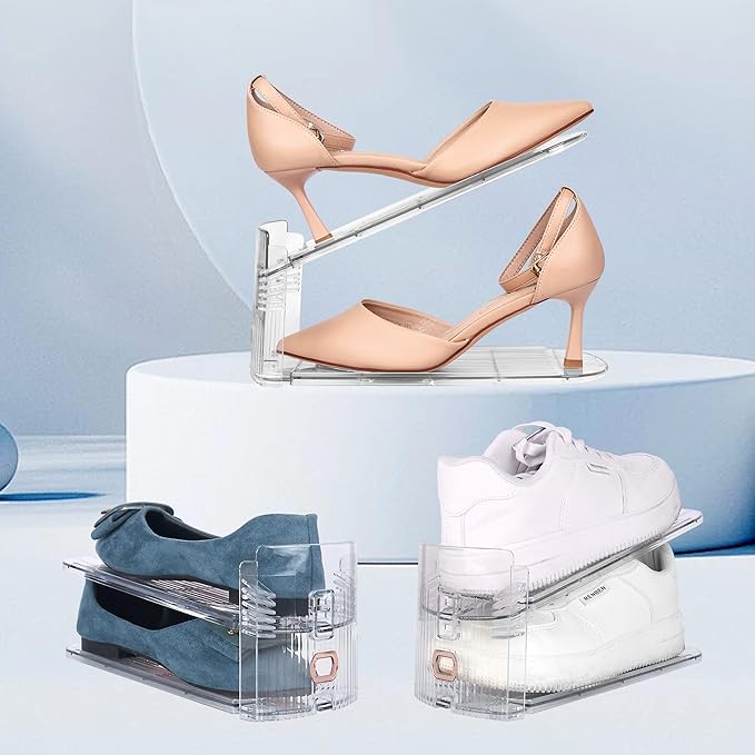 - Durable Material & Slip-proof Surface:: The shoe organizer is made of high-quality ABS plastic and non-toxic PP material, which are sturdy, durable, and easy to clean. The concave and convex shoe support surface prevents your shoes from sliding off or scratching. It also has a curved edge that protects your shoes from deformation or damage.