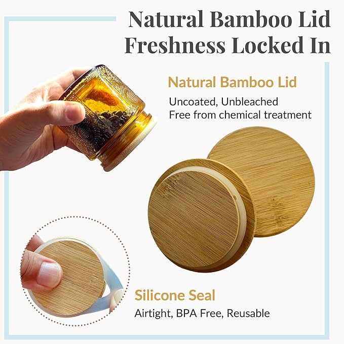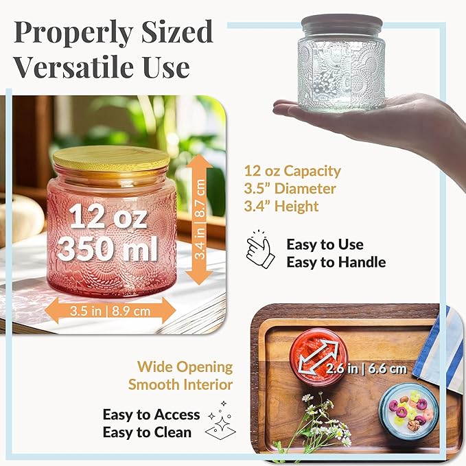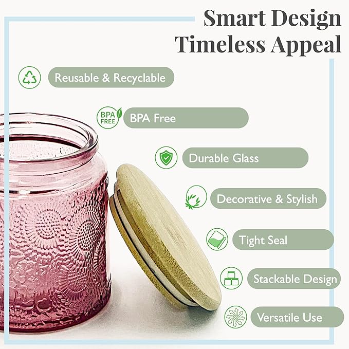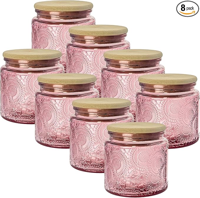 12 oz Decorative Glass Storage Jars with Airtight Bamboo Lids - 8 Pack Pink - Sunflower Embossed Spice, Candle & Home Organizer Set