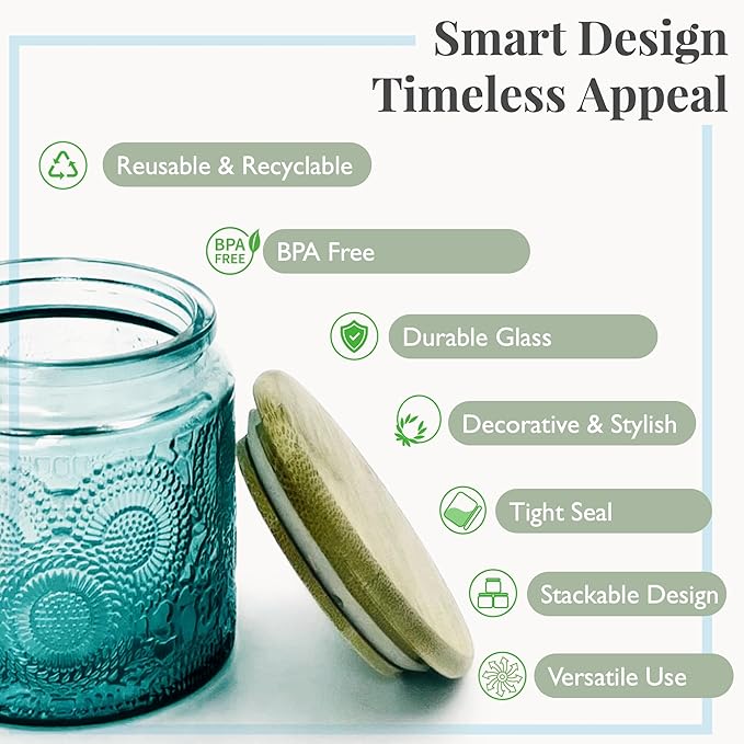 - Colorful Vintage Design: 8 glass jars in teal blue color, each embossed with a charming sunflower motif. Adds a pop of style to pantries, countertops or decor