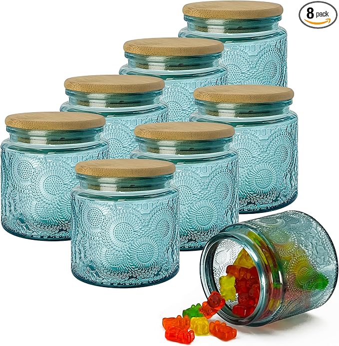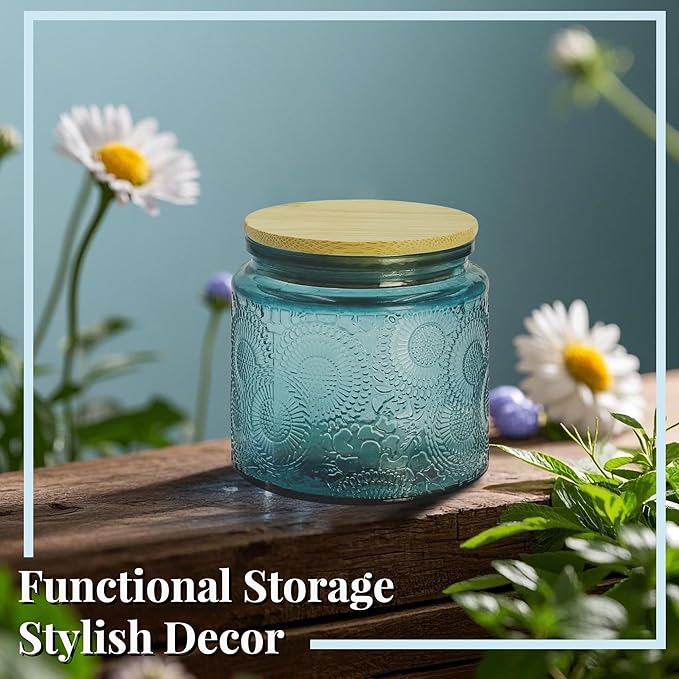 12 oz Decorative Glass Storage Jars with Airtight Bamboo Lids - 8 Pack Blue - Sunflower Embossed Spice, Candle & Home Organizer Set