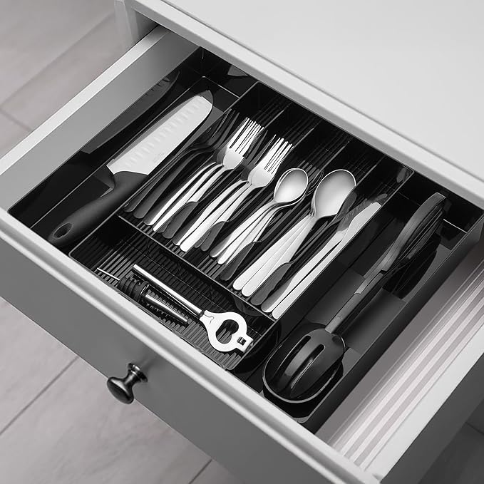 - Versatile Use: This utensil drawer organizer has plenty of space to organize a variety of flatware including spoons, knives, forks, spatulas, whisks, tongs, ladles, scissors, and more. Use as a cutlery drawer organizer, kitchen utensil organizer, flatware organizer for drawer, silverware tray, spoon organizer, utensil tray, and more.