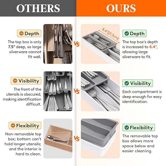 - Deepened Storage Space: Each compartment is deepened to securely hold more silverware, allowing you to stack your silverware without worrying about the ends sticking out and preventing the drawer from closing
