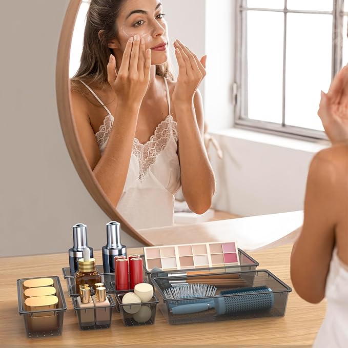 WOWBOX 44 PCS Clear Plastic Drawer Organizer Set, 4 Varied Size storage Bins and Desk Drawer Organizer Trays for Makeup, Gadgets, Jewelry and Utensils in Bathroom, Bedroom and Office, Clear Black