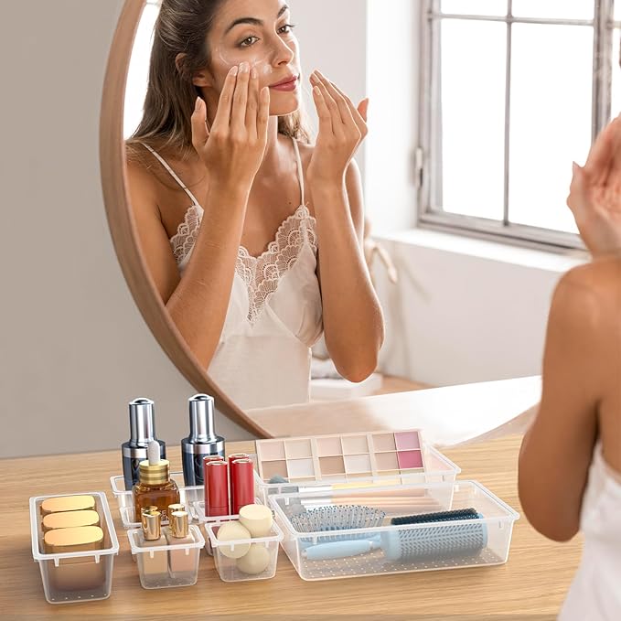 WOWBOX 44 PCS Clear Plastic Drawer Organizer Set, 5 Varied Size storage Bins and Desk Drawer Organizer Trays for Makeup, Gadgets, Jewelry and Utensils in Bathroom, Bedroom and Office, Clear