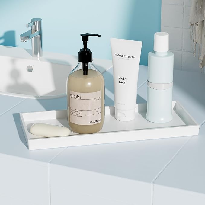 - Easy Clean:Waterproof design suitable for wiping with a damp cloth or rinse clean.Lightweight,resists warping in humidity and dishwasher safe.Recyclable,perfect as a bathroom counter tray,perfume tray or toilet tray