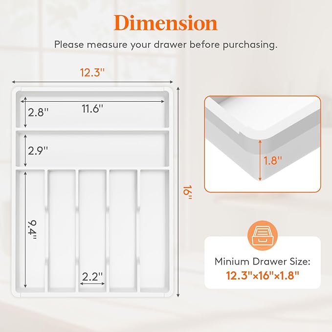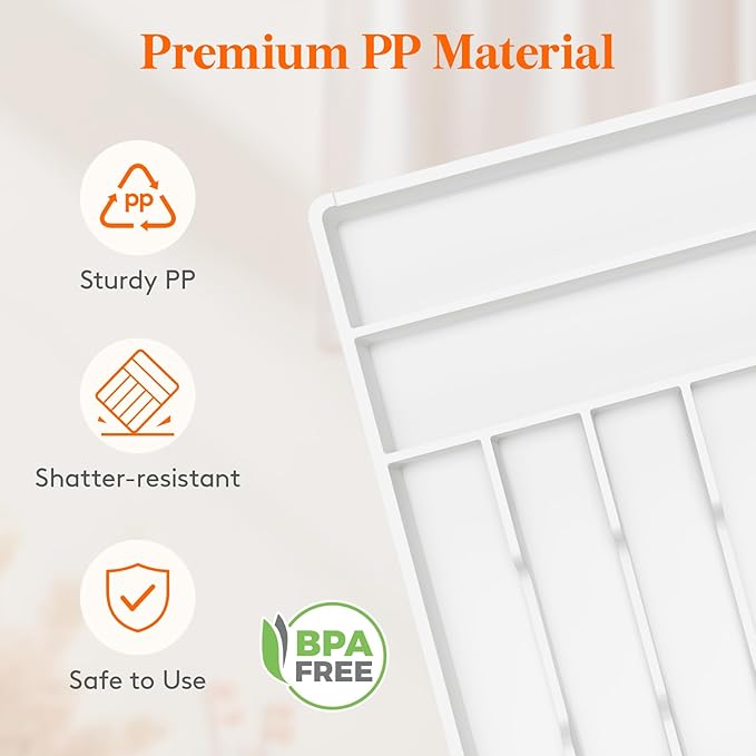 - Sturdy and Safe: Crafted from sturdy food-grade PP material, this kitchen drawer organizer can handle everyday use with ease. Plus, it’s BPA-free, ensuring the safety of all types of flatware