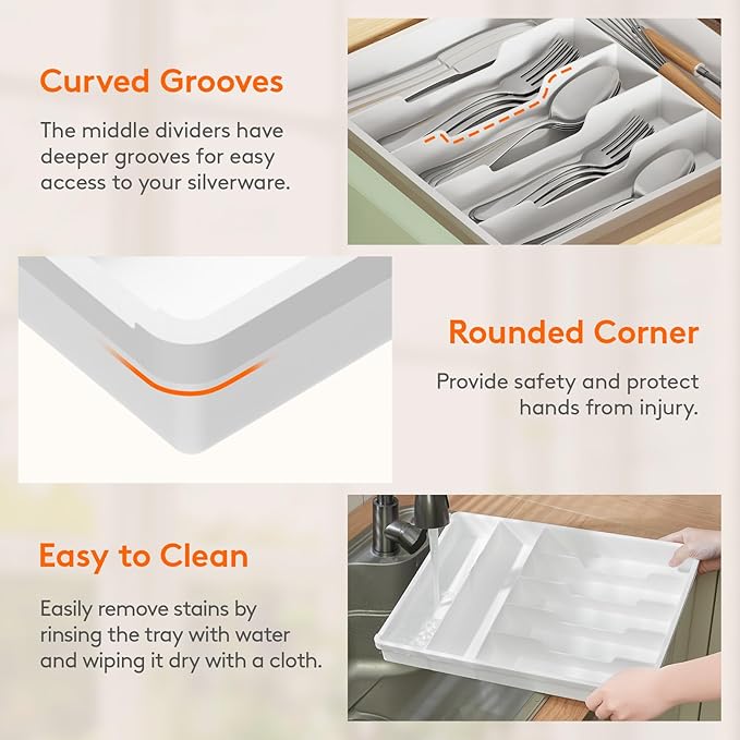 - User-Friendly Design: The cutlery drawer organizer features curved grooves for easy access to utensils. To clean, simply rinse with water or wipe with a cloth to remove stains. Please note, it is not dishwasher safe