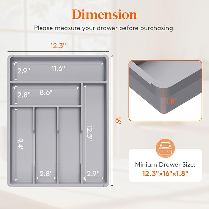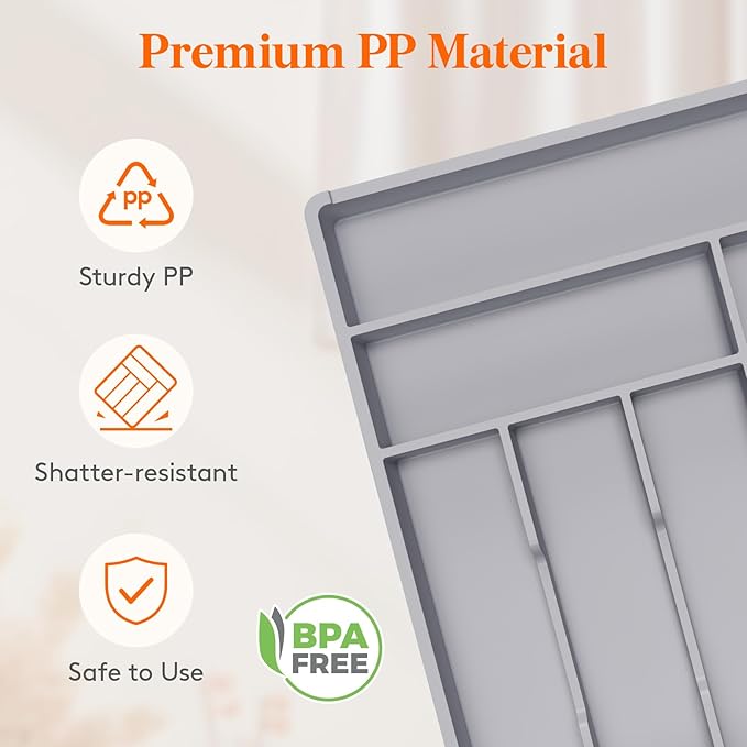 - Sturdy and Safe: Crafted from sturdy food-grade PP material, this kitchen drawer organizer can handle everyday use with ease. Plus, it’s BPA-free, ensuring the safety of all types of flatware
