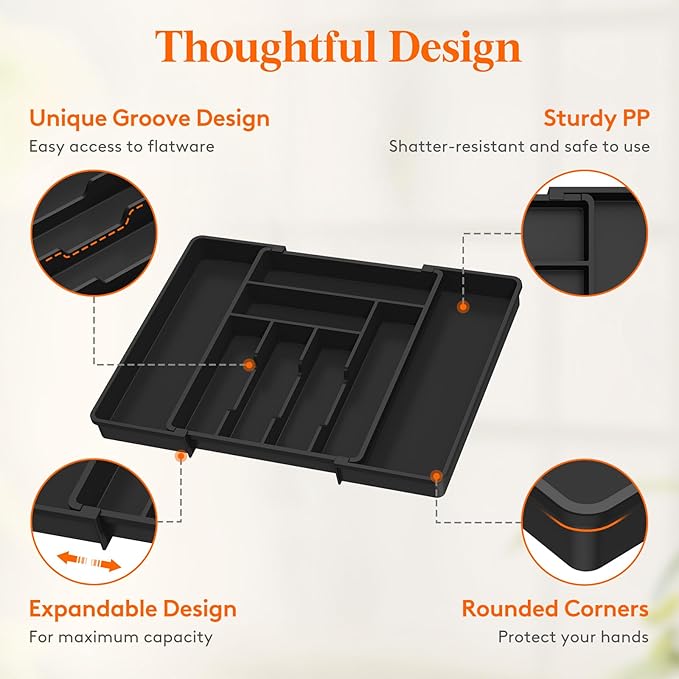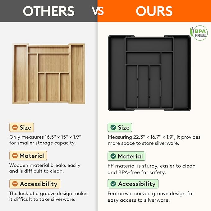 - Large Capacity: Declutter your drawers and free up more space. Our silverware organizer features two expandable side panels that provide ample space to store more flatware and kitchen utensils