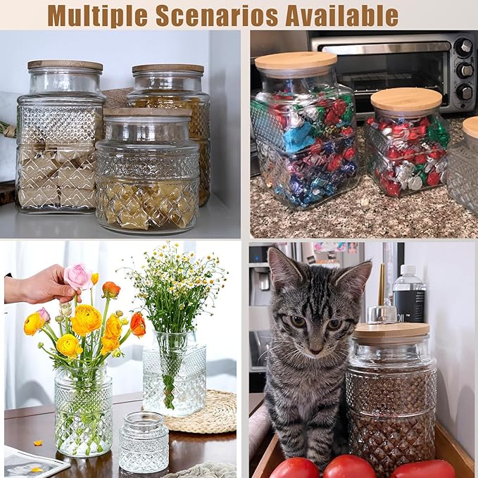 - 【Widely used】Clear glass jars can see the food inside, eg:ground coffee/sugar/tea bags/Snack/nuts/flour/cookie/oats/pasta/coffee pods/dog cat treats/flower vase/laundry pods