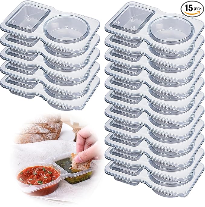 15-Pack Reusable Double Compartment Condiment Containers with Lids - Leak-Proof 2-Section Disposable Snack Cups for Sauce, Dips, Sampling & Travel Portions