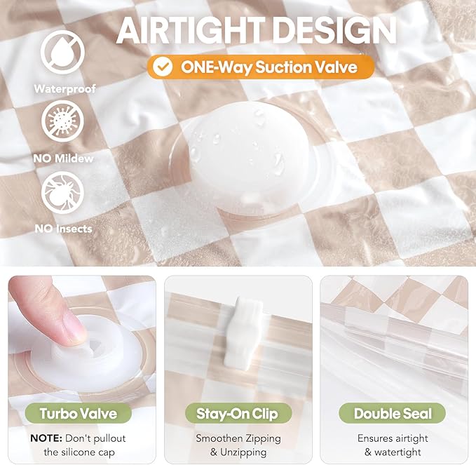 - High-Quality Materials: Our vacuum seal bags for clothing travel are made of premium quality PA+PE,double zipper seal and triple-seal turbo valve, sturdy and tear-resistant. The sealing strip is made of high quality rubber, preventing air leakage and lasting sealing. The thickened and sturdy vacuum bags can be reused and stored for a long time.