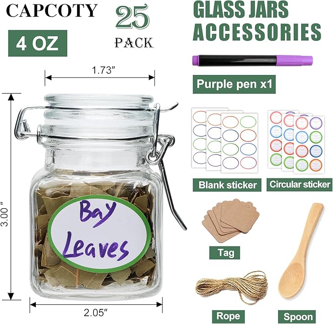 Brajttt 4 oz Spice Jars with Labels,25 Pack Small Glass Jars with Lids,Small Glass Containers with Airtight Hinged Lid for Home Kitchen, Arts & Crafts Projects, Spices, Decoration, Snack Foods