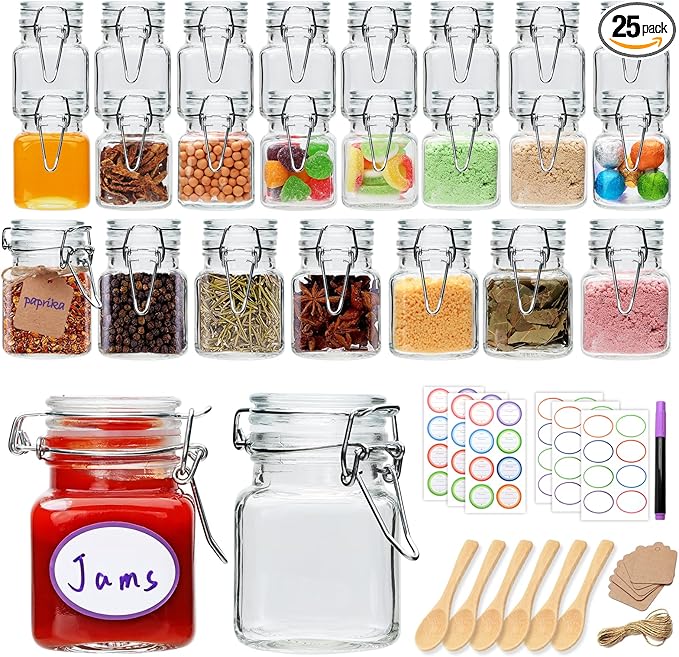 - Complete Spice Jars Set-This set offers 25 glass jars, Each set comes with labels, pen,twine tag and wooden spoon. Fill them with your special spices and gift them to friends, use as party favors, add a fun design element for party, or simply use them in your home to keep things fresh or organized.