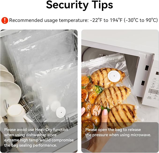 - Microwavable&Dishwasher, Freezer-safe: When using a dishwasher, please avoid the heat drying option, as extreme high temperatures may compromise the bag’s seal. When using a microwave oven, make sure to open the bag slightly to release pressure, and do not set the temperature above 90°C (194°F)