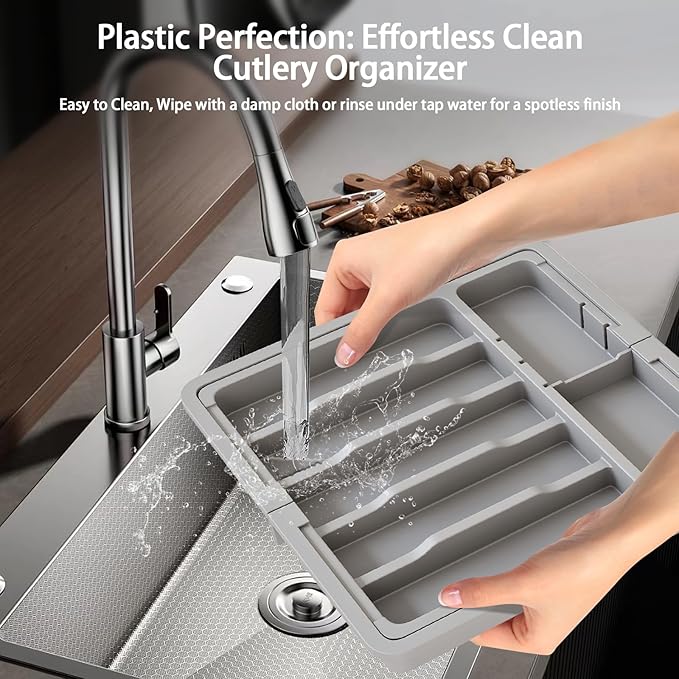 - EASY TO CLEAN: Cleaning up after cooking can be a chore, but not with our utensil organizer. Its plastic construction is both washable. After a long day of cooking and using your utensils, simply take the organizer to the sink and rinse it under running water