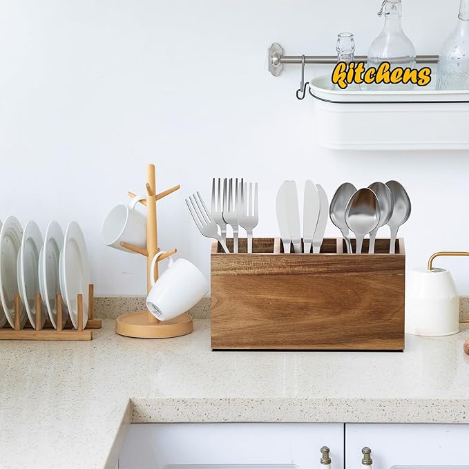 - 【Wooden Silverware Holder】Handcrafted from natural acacia wood, with clean and smooth lines, sturdy and durable, easy to clean, just wipe gently with a damp cloth.