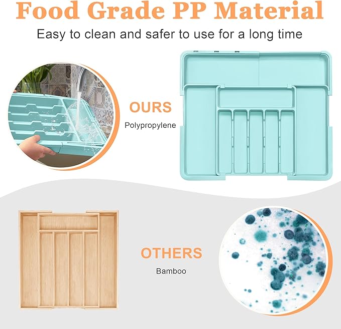 - Premium Food Grade Material: The silverware drawer organizer for kitchen utensils is crafted from premium PP material that is BPA-free and long-lasting for use. Just rest assured that it can guarantee the safety of all your utensils, silverware, and flatware.