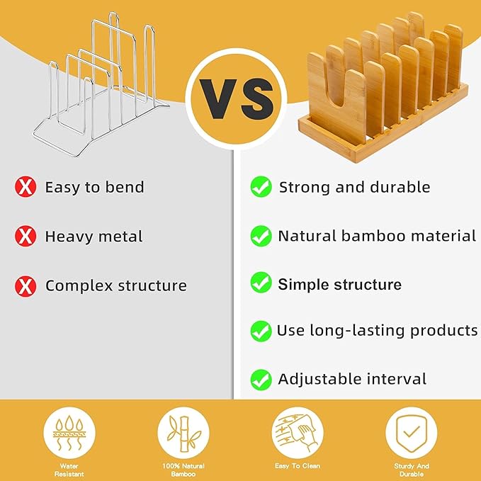 - Durable and Safe Material: It is made of natural bamboo products. The stand is better upgraded, more durable and stable to hold heavier cookware. Natural bamboo products can better match the cookware and style of the kitchen,The smooth surface can protect your kitchen items from being scratched