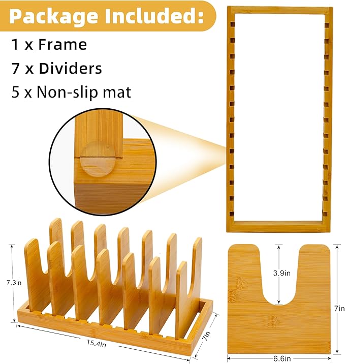 - Dimensions - Overall Dimensions :15.4"x 7"x 7.3" inch; There are slots with width to suit your different needs. The design of the partition can better place the pot lid. Every detail change is to better display and store some kitchen items. It is a beautiful and practical kitchen storage item.
