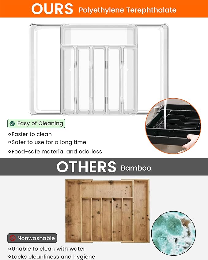 - Food Grade Material & Clutter-Free Aesthetics: Crafted from premium food-safe PET material, this large & small utensil drawer organizer guarantees the safety of all your utensils, silverware, and flatware. Made of 2.95Ib reinforced spoon organizer, known for its exceptional durability, it resists wear and tear. Also the silverware tray features crystal-clear transparency, delivering uncluttered luxury - seamless integration with modern kitchen decor.
