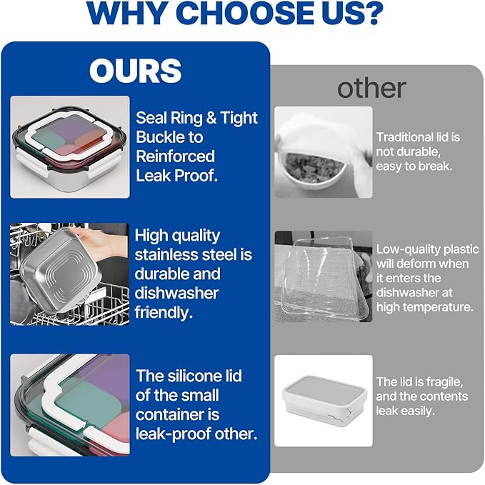 - 【Shatterproof Design】Unlike plastic or glass alternatives, these stainless steel containers are shatterproof, making them a safer and more reliable option for storing food at home, work, or on the go