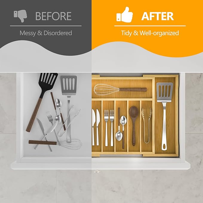 - A MUST-HAVE FOR TRUE FOODIES - With our 13" - 23" wide, 15" long and 2" deep bamboo drawer organizer, you can say goodbye to your out-of-control kitchen drawer. It keeps kitchen utensils accessible and well-organized as you need, and optimizes the drawer storage.