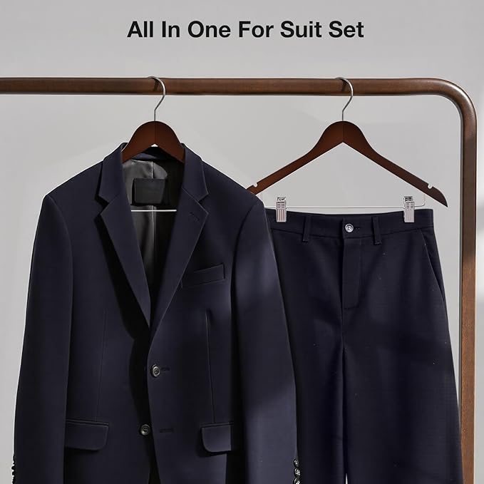 - Two In One Space Saving Hangers - Measure 17.5"Lx 9.5"H x 1/2" thickness.The ultra-thin design maximizes storage space.The shoulder contours of the wooden hanger mimic human shoulders,keeping your suit in nice shape and hang your pant with clips.2Pcs matching Outfits on 1 hanger can save times in selecting clothes and create more closet space up to 100%.