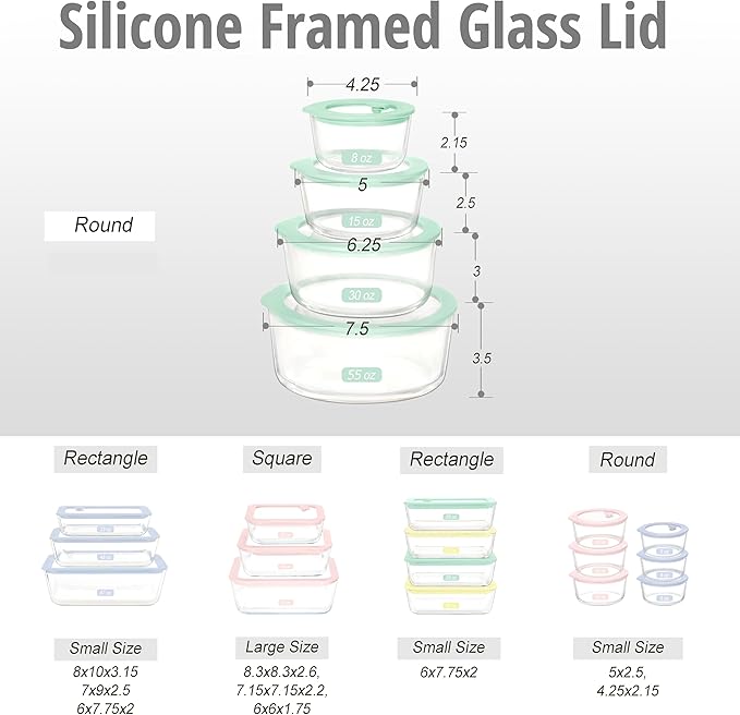 - ✅WHAT’S IN THE BOX: Each set comes with the Glass containers and their matching Silicone Framed Glass Lids. Round Shape Size: 55oz, 30oz, 15oz, 8oz,(7.5x3.5, 6.25x 3, 5x2.5, 4.25x2.15)